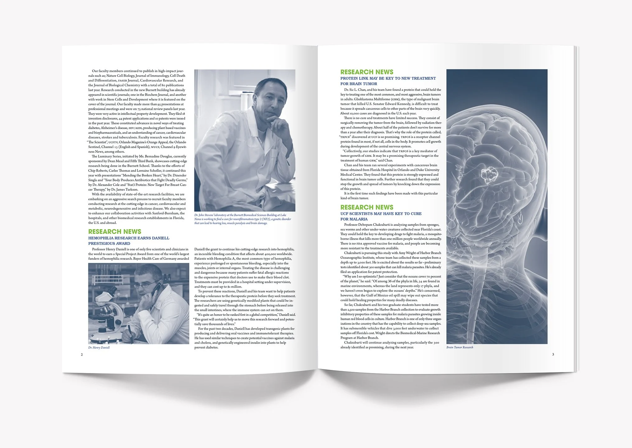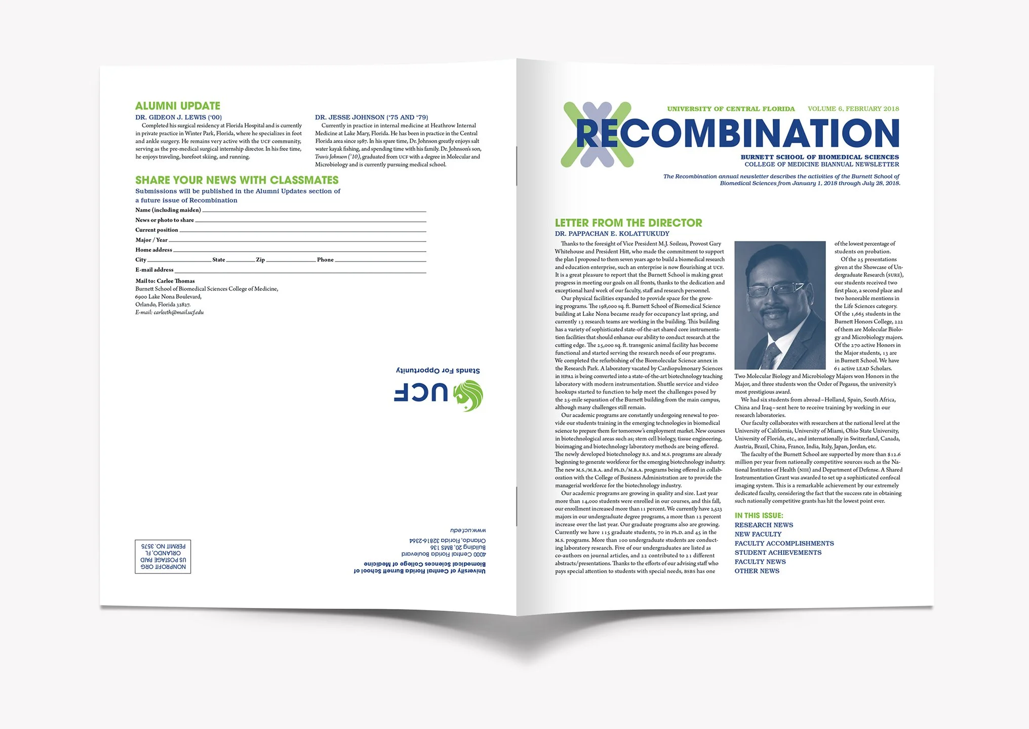 Recombination is a mock-up newsletter designed for the Burnett School of Biomedical Sciences. This newsletter is designed as an 8.5 x 11 inch self-mailing 8-page spread that utilizes three spot colors. All text and images were provided by the professor who posed as a “difficult” client. Low res images were sent, files were given to me late, and last minute changes were requested.